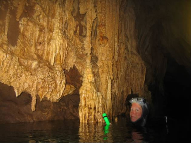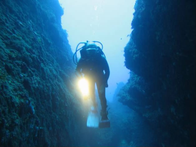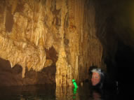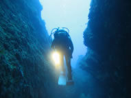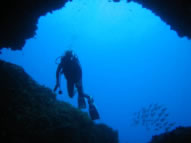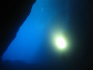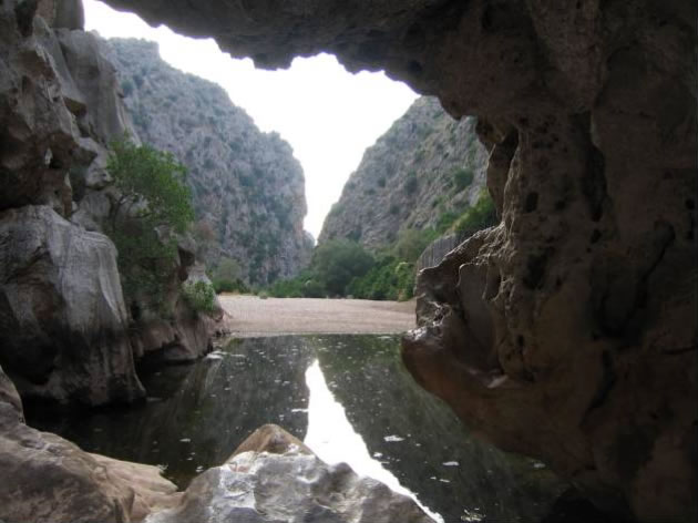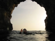 Recht unsicher hüpften wir zur nächsten Traumbucht Sa Calobra, von wo aus wir nach Menorca zu unserem Lieblingstauchplatz, der Unterwassertropfsteinhöhle Pont d´en Gil segeln wollten. Zwar war der Tauchgang bei Sa Calobra eher enttäuschend dafür war der Ankerplatz eingebettet in einem mit einen Kiesstrand auslaufenden Canyon um so schöner. Auch der Canyon selbst mit seinen über 300 Meter hohen Felswänden und den darin umherstreifenden Ziegen war den Besuch wert. Überraschender Weise blieben wir diese Nacht von Fallwinden verschont und erreichten am nächsten Tag Menorca dank des guten Südostwindes noch vor Sonnenuntergang. Schnell waren die Tauchflaschen ausgepackt und schon waren wir in der Tropfsteinhöhle, die für uns als höhlenbegeisterte Taucher das Non Plus Ultra darstellt.