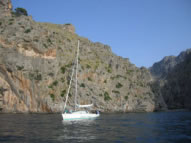 So konnten wir mit Motorunterstützung unsere beiden Anker bergen und uns mit knapper Not von der Felswand retten, da unser schwacher Motor das Boot nicht gegen den Wind halten konnte. Kaum hatten wir das freie Wasser erreicht erwarteten uns bisher noch nie erlebte 60 Knoten Wind, die in kürzester Zeit eine unglaubliche See aufbauten. Das Boot hatte als wir versuchten auf Halbwindkurs direkt das nur 5 Meilen entfernte Porto de Soller anzulaufen ohne Segeln eine derartige Krängung, dass der Bordrand unter Wasser kam. So beschlossen wir vor dem Wind abzulaufen in der Hoffnung, dass die zweifellos vorhandene thermische Komponente des Windes weiter draußen abnehmen würde. Bald wehte es auch mit "nur mehr" 45 Knoten und wir konnten mit Sturmfock die beachtlichen 5 Meilen, die wir vom Wind abgetrieben wurden wieder zurück kreuzen und liefen völlig erschöpft um zwei Uhr Nachts in Porto de Soller ein. Zur Beruhigung genehmigten wir uns einen Schluck Portwein und brauchten ein paar Tage um uns von dem Schock zu erholen.