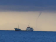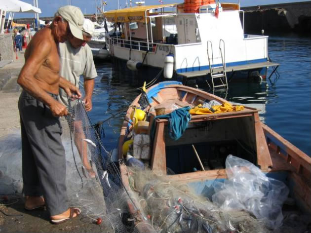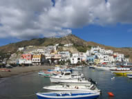 Weil wir zufällig alles beobachteten konnten wir eine Kollision vermeiden und der völlig überforderten, allein an Bord befindlichen Bordfrau behilflich sein den Motor zu starten und die Ankerwinde zu betätigen. (Ihr Mann war zum Bäcker gerudert und hatte jetzt Probleme bei dem starken Wind zum Boot zurück zu kommen) Das Spektakel wurde noch abgerundet durch ein weiteres Boot, das ebenfalls knapp an uns vorbeigedriftet ist und nun gemeinsam mit dem deutschen Schiff in dem quer über die ganze Bucht ausgebrachten Reusen hing. Die Fischer hatten nun alle Hände voll zu tun ihre Reusen zu retten und die Schiffe zu befreien. Als wir noch zwei Wasserhosen beobachteten und fotografiert hatten, die in unmittelbarer Nähe an uns vorbeizogen legte sich der Wind etwas und wir konnten bei herrlichem Sonnenschein weiter zu dem netten Fischerdorf S Angelo an der Südküste der Insel fahren.