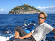 Ungern lichteten wir den Anker, aber es gab ja noch so viel zu entdecken! So kamen wir schon nach wenigen Stunden in der Dämmerung auf der Insel Ischia an und ankerten in dem geschützten Hafen Forio an der Westküste. Ischia ist bekannt für seinen Wein und die Thermalbäder haben schon den alten Römern und unserer Kaiserin Elisabeth gedient. In regelmäßigen Abständen wurde Ischia durch Erdbeben und Vulkanausbrüche zerstört, von denen man aber heute nichts mehr merkt. In Forio bewunderten wir die alten Kirchen und Burgen und schleckten mit Genuss das italienische Gelati. An der Ostseite der Insel fanden wir geschützt durch den Burgberg Ischia Ponte einen unglaublich attraktiven Ankerplatz, der mir als Ausgangspunkt für eine Radtour auf den 800 Meter hohen Vulkangipfel diente. Immer wieder fielen mir förmlich Weintrauben als Stärkung in die Hände und so war es ein leichtes die spektakuläre Aussicht vom durch steile Felsen gebildeten Gipfel über die ganze Insel zu genießen. Ein über uns hinwegziehendes Tief brachte Regen, Gewitter und Sturm und so driftete eine deutsche vor uns ankernde Yacht, die zu wenig Kette gelegt hatte am Morgen direkt auf uns.