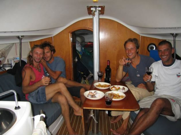 So gab es in der Höhle immer noch den 2 Meter Congeraal, der Conny fast zu Tode erschreckte und in dem gemütlichen Cafe an der befestigten Uferpromenade wurde immer noch U2 gespielt. Abends führte ich zur Abwechslung einmal Conny in eine leckere Pizzeria aus, um mich für die Leckereien zu bedanken mit denen sie uns auch bei schwersten Wetter an Bord verwöhnt. Nächstes Ziel war Porto Pollo in der Strasse von Bonifaccio, eines von Europas Top- Surfrevieren. Nach einem Zwischenstopp auf der ehemaligen Gefängnisinsel Asinara erreichten wir Porto Pollo bei gewittrigem Wetter und schon abflauendem Mistral, so dass Surfen an diesem Tag leider nicht mehr möglich war. Am nächsten Tag wartete Neptun allerdings wieder mit einer kleinen Überraschung auf und ließ und nicht einmal ein wenig verschnaufen. Nach einem verregneten Vormittag, den wir gemütlich in unserem Schneckenhaus mit Lesen verbrachten, drehte der Wind auf Nordost und wurde immer stärker.