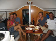 Nach 1,5 Tagen erreichten wir nach einer gewittrigen Nachtfahrt den kleinen aber gut geschützten Hafen in der Bucht von S Maria und waren gespannt was uns, die wir meinten im Mittelmeer schon alle Tauchattraktionen gesehen zu haben Ustica wohl noch bieten konnte. Mitten in dem kleinen aber sichern Hafen konnten wir als einziges Segelboot ankern und uns mit dem Heck an eine freie Mouringtonne hängen. Wie sich herausstellen sollte war dies unser neues Zuhause für zwei Wochen. Schnell schloss uns der Tauchschulbesitzer David ins Herz, von dem ich einen Spezialschlüssel für die Reparatur meines Reglers borgte. Vielleicht gefiel ihm, dass es noch Taucher gibt die ihren Regler selbst reparieren. Jedenfalls lud David uns auf eine Inselrundfahrt mit seinem Tauchboot ein, bei der er und sein Divemaster Francesco uns sämtliche Divespots inklusive GPS Koordinaten verrieten. Damit der Gastfreundschaft nicht genug - die beiden nahmen uns in die Tauchergemeinschaft von Ustica auf, zeigten uns die beste Bar und Pizzeria und verrieten uns noch einige Geheimtipps wie das Brioche con Gelato in der Bar Centrale - hervorragendes italienisches Eis anstelle im Becher in einem aufgeschnittenen Milchweckerl.