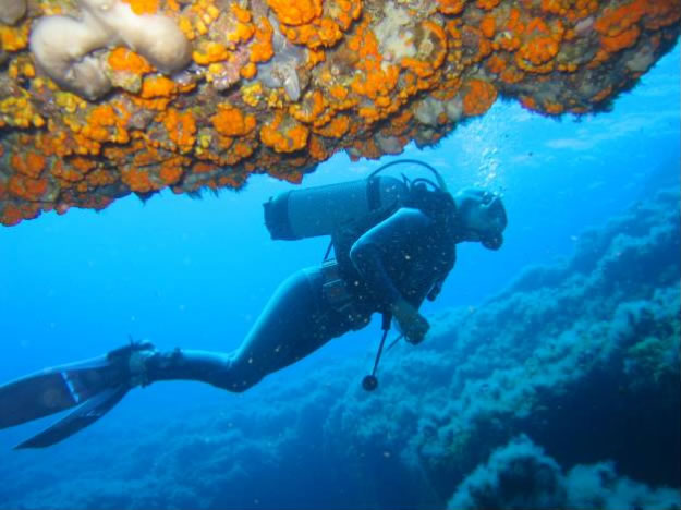 Die Insel selbst bot tolle Wanderwege entlang der Küste oder über die mit Pinien bewachsenen Berge und kann mit eigenem Wein aufwarten. Ein netter Weinbauer, dem wir ein paar relativ teure Flaschen abkauften ließ uns in seinem Gemüsegarten die unzähligen reifen Tomaten und das frische Basilikum ernten aus denen Conny ein Spagetthisugo zauberte, das sogar von unserem sizilianischen Freunden gelobt wurde. Für den Archäologisch Interessierten gibt es alte Gräber und andere Ausgrabungen zu bestaunen. Die reifen Feigen fallen einem beim Joggen förmlich in den Mund. Überhaupt fühlten wir uns bald wie zu Hause - alle grüßten uns schon lächelnd als die Verrückten, die mit dem Minischlaucherl ständig um die Insel zum Tauchen fahren - das Meer war spiegelglatt und im Hafen schliefen wir ruhig wie in einem Hotel. Die Tauchplätze waren wirklich einmalig. Die abgekühlte Lava der Insel mit ihrer vulkanischen Vergangenheit bildet riesige betauchbare Höhlen und Canyons oder bizarre Riffs die wie Nadelspitzen aus den blauen Tiefen senkrecht hoch steigen. Fast bei jedem Tauchgang wurden wir von gewaltigen Zackenbarschen von über einem Meter Länge umringt und bestaunten sogar einmal eine gewaltige Herde Barakudas von über 100 Fischen, die ohne Scheu mit uns schwamm und uns förmlich einhüllte.