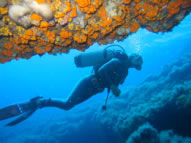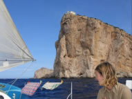 Morgens machten wir uns schon bald auf zu unserem nächsten Ziel Alghero in Sardinien. Dort entdeckte ich schon drei Jahre zuvor die tolle Unterwasserhöhle Grotta di Nerea, die ich nun Conny unbedingt zeigen wollte, da diese ohnehin praktisch auf unserem Weg lag. Auf der Reise begleitete uns diesmal ein kleiner Piepmatz, der einen ganzen Tag damit verbrachte das Boot zu erkunden und so ziemlich alles voll geschissen hat. Nach zwei Tagen liefen wir mitten in der Nacht in Porto Conte ein und fanden neben anderen Seglern einen Ankerplatz gleich in der Nähe der Unterwasserhöhle. Zwei Tage mit mehreren Tauchgängen lang erforschten wir die 250 Meter lange und mit etlichen Lebewesen wie Hummern, Langusten, Congerale, Welse und natürlich Tauchern bevölkerte Höhle und stellten fest, dass man hier in Alghero mit seinen vielen Unterwasserhöhlen und Steilwänden ohne weiteres einen mehrwöchigen Tauchurlaub verbringen könnte. Überhaupt war ich fasziniert, wie wenig sich Alghero in den drei Jahren, seit dem ich das letzte Mal hier war, verändert hatte.