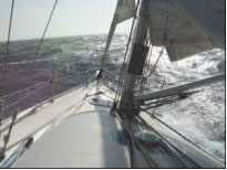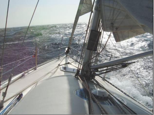 Selmas Bein war nicht gebrochen und damit stand die Entscheidung fest: Anker auf um 10 Uhr morgens. Da Ostwind gemeldet war sollten wir, wenn um 14 Uhr die Strömung kippt, problemlos aus dem Schwimmteich in das große Meer gespült werden. Voll bewaffnet mit Spi zogen wir mit 20 Knoten Rückenwind in den Kampf. Der Wind steigerte sich auf 35 Knoten und wir mussten abrüsten, bis nur mehr Genua ausgebaumt mit doppelt gerefftem Groß übrig war. Genau als das Mittagessen serviert war, begann das Meer plötzlich zu kochen. Meterhohe Wellen rollten aus allen Richtungen heran, türmten sich hinter uns zu Bergen von 4 Metern auf und brachen über uns mit lautem Knall. Das Boot war alleine kaum noch zu steuern. Gerade als mich Thilo ablöste kam eine besonders giftige Welle kombiniert mit einer Bö und beschleunigte uns auf unseren Rekordspeed von 17,4 Knoten. Als der 6 Tonnen schwere Bug das Wasser mit einer Geschwindigkeit durchpflügte, die locker schon zum Wasserschifahren gereicht hätte, blieb mir vor Ehrfurcht fast das Herz stehen. Eine meterhohe Bugwelle erzeugte ein Rauschen wie in einem Wildfluss während wir alle nicht so recht wussten, was mit uns geschieht. Also schnell die Genua weggerollt - schließlich wollten wir es ja nicht übertreiben. Trotzdem blieb das Boot bedingt durch die verrückten Wellen fast unsteuerbar und surfte mit über 15 Knoten munter durch die Gegend. Ein Blick auf das GPS war etwas entmutigend: Speed over Ground waren trotz der 15 Knoten nach Log nur 7 Knoten, also hatten wir bedingt durch hohe Verdunstung des Mittelmeeres eine zur Mitte der Strasse von Gibraltar stärker nach Westen setzende Gegenströmung von über 6 Knoten, die auch der Grund für die ungewöhnlich steilen Wellen waren.