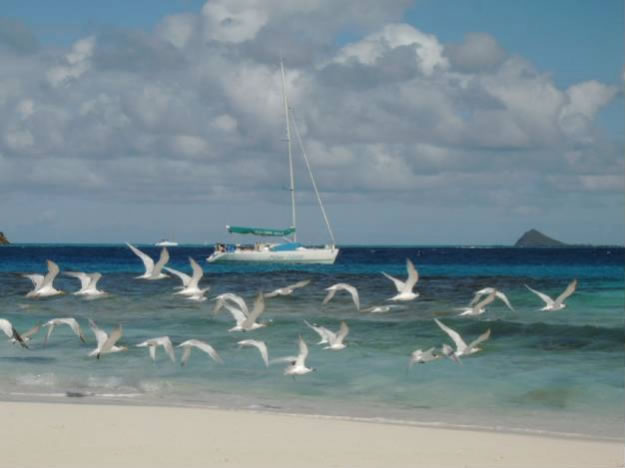 Und die Tobagos sind, was die Klarheit und türkisgrünen Farben des Wassers und die Einzigartigkeit bedingt durch die riesige Lagune gebildet vom Horse Shoe Reef betrifft, wirklich nicht zu überbieten. Wie im Reiseführer beschrieben - kaum fiel unser Anker, mussten wir ausgerüstet mit Schnorchel und Taucherbrille einfach alle ins Wasser springen. Die Tage auf den Tobagos vergingen leider wie im Flug mit Tauchen am Horseshoe Reef, Inselerkunden und Surfen. Ein Highlight war die kleine Insel Petit Tabac, die wir an einem Tag mit der Blue Note besuchten.