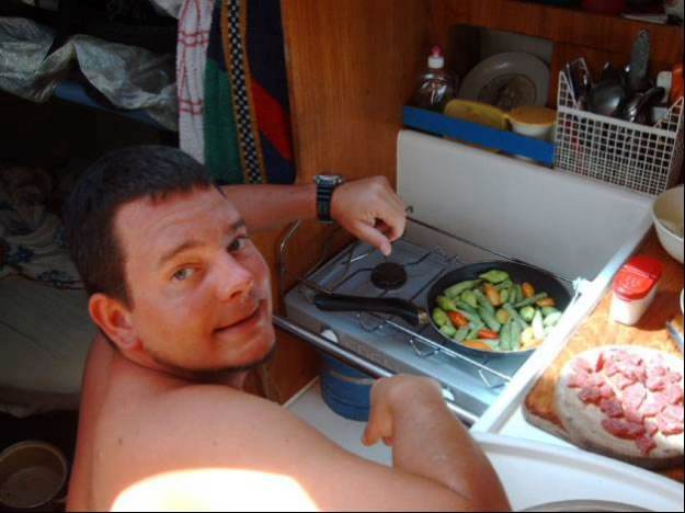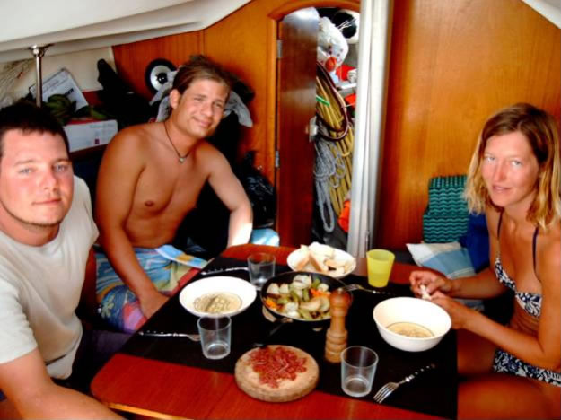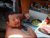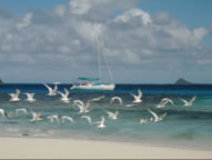 Nicht nur die Matrosen fielen dem Hurrikane David zum Opfer - auch der Kapitän konnte sich gerade noch aufs Schiff retten - die Bootsschlüssel wurden fortgespült und konnten erst am Morgen nach aufwendiger Suchaktion geborgen werden. Als einzig Tapferer kämpfte ich mit einem Riesenbarrakuda - nicht einmal das Filetieren erfreute Christian heute, wie sich unschwer aus der grünlichen aus seinem Mund in drei großen Schwällen kommenden Flüssigkeit erkennen ließ. Auf der Insel Canouan erholten sich Klaus und Christian von den Strapazen am Strand in Corbay, während Conny und ich bei einem schönen Tauchgang eine Schildkröte und mehrere Muränen aus nächster Nähe beobachten konnten. In der Rameau Bay zauberte Conny vier herrliche Barrakuda Filets mit Curry Sauce und Christian musste schmerzhaft feststellen, dass Hummerscheren doch schärfer sind als jene der Flusskrebse, für die seine Reuse ausgelegt ist. Tatsächlich haben die Biester den Köder rausgefressen und die massive Reuse zerbissen. Die nächste Insel, die wir besuchten war Mayreau, wo wir in der Saline Bay den Österreicher Heinz mit seinem Schiff Alegria trafen und zu kaltem !!! Bier und sonstigen Leckereien auf seiner Oyster 52 eingeladen wurden.