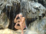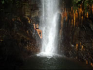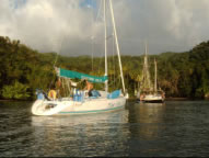 Hervi und Catherine trafen wir fast auf allen Ankerplätzen in Grenada wieder. Zwischen Carriacou und Grenada besuchten wir noch die wilde nur temporär von Fischern bewohnte Insel Rhonde, die uns sehr an unser Erlebnis in der Cane Garden Bay erinnerte. Die Atlantikroller bogen sich irgendwie um die Insel in die Bucht und brachen mit schaurigem Getöse und meterhoher Gischt an den vorgelagerten Felsen. Bald war uns die Schaukelei zu dumm und weiter ging es nach Grenada, wo wir von der Ankerbucht Hallifax aus die Concord Falls besichtigen wollten. Wir trauten unseren Augen nicht als wir auf dem einzigen Boot in der Bucht, einem alten Holzkutter, eine österreichische Fahne wehen sahen. Martin war damit auch von den Kapverden nur drei Tage nach uns über den Atlantik gesegelt. Zusammen erkundeten wir die Concord Falls, verwöhnten unsere salzverkrustete Haut und Haare mit Süßwasser und sammelten Muskatnüsse, die hier einfach überall herumlagen. Auch Bananen und Mandarinen gab es im Überfluss. Bei einem Einheimischen, den Martins Taxifahrer kannte, kosteten wir leckeren Sorrel Juce und selbst angesetzten Zuckerrohrwein, der unserem Most in punkto Geschmack locker das Wasser reichen kann, aber im Alkoholgehalt weit überlegen ist. Schon etwas schwindlig fanden wir dann wieder zu unserem Boot und ließen den Abend auf Martins Boot mit einem Sundowner ausklingen.