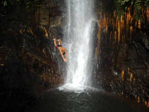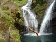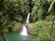 Und das nächste Abenteuer wartete auf uns: eine rasante Fahrt - mit Überholmanövern durch unübersichtliche Kurven, mehreren beinahe Crashs, die von freundlichem Hupen und Winken begleitet wurden sowie ständigem Geheule des Motors an der Grenze zum roten Drehzahlbereich - mit dem Inselbus (Subaru Van zugelassen für maximal 12 Personen) mit 19 teilweise ziemlich übel riechenden Landsleuten besetzt, der uns zum Grand Etang, dem großen Kratersee in luftiger Höhe brachte. Wir dankten Gott, dass wir den Anblick des wie der Neusiedlersee anmutenden Sees, noch erleben durften und wanderten weiter zu den Seven Falls - die in mehreren Stufen durch den dichten Regenwald brausten und eine erfrischende Bademöglichkeit boten. Wir fühlten uns alle ein wenig wie Tarzan und Jane als wir in das glasklare Wasser sprangen. Retour entschieden wir uns aus Sicherheitsgründen für Autostopp und kamen so mit einem netten Pfarrer wieder ins Tal zurück.