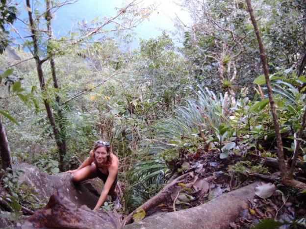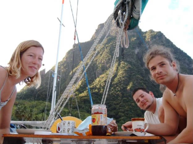 Weiterhin war Neptun auf unserer Seite - vor den Pitons schnorchelten wir ein wenig am Caille Point und fanden tatsächlich mitten am Riff einen 18 kg Anker mit 30 m Kette. Unser Ankerplatz Malgre Tout direkt unter dem Petit Piton, der fast senkrecht 800 Meter aus dem Meer wächst, ist wohl der eindrucksvollste Ankerplatz auf den wir je ankerten (in diesem Fall für 40 EC "mooringten", da ankern ja verboten ist). Nachmittags kämpften sich Conny und ich in einem Traunstein - ähnlichen Klettersteig , den uns einer der selbsternannten Führer natürlich nur gegen Geld verraten hatte auf den Gipfel und genossen den unbeschreiblichen Ausblick auf unser Boot. Als wir eine warme Dusche in den Hot Falls am Fusse des Pitons nahmen und auf unseren Berg sahen konnten wir nicht glauben dass es möglich war dort hoch zu klettern.