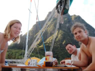 Umso enttäuschter war ich, als ich feststellen musste, das der dämliche Dieb aus St. Vincent meinen Mastfuß mitgenommen hatte. Also konnte ich nur das kleine Segel mit dem Reservemastfuß verwenden, was aber immer noch ausreichend war. Beim Surfen lernten wir den Franzosen Gerald und seine Frau kennen, die auch wie die Mambo mit Kind und Kegel auf einem Katamaran unterwegs waren. Schließlich kam der Tag, an dem wir uns von Klaus trennen mussten - wir feierten gebührend Abschied im Restaurant Bouganvilla in Union Island, wo wir neben Lobster und T-Bone Steak auch noch andere Inselschönheiten vorgeführt bekamen.... Der Begriff "Kapitänsdinne" bekam in diesem Lokal eine sympathische Bedeutung: der Kapitän speist bei größeren Gruppen frei.