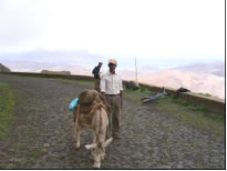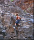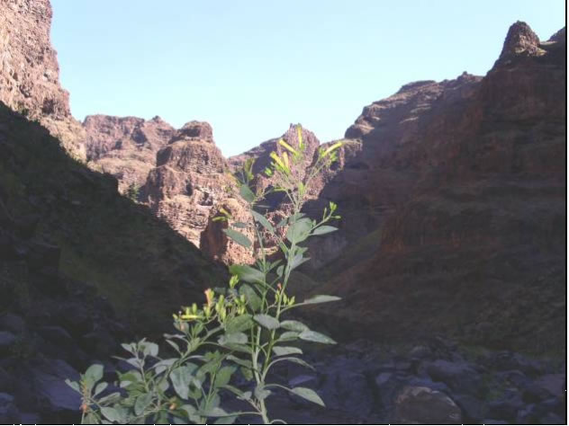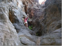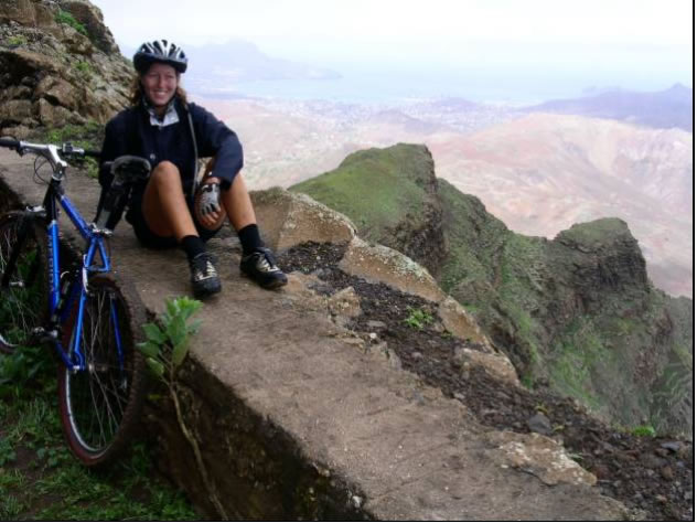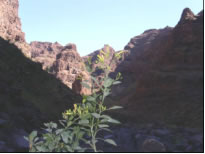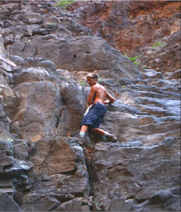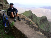 Für den nächsten Tag hatten wir eine Biketour auf den 1400 Meter hohen Monte Gordo geplant. Es ging schon um 5 Uhr früh los und bei Sonnenaufgang hatten wir das karge wüstenähnliche Vorgebirge hinter uns gelassen. Je höher wir kamen, umso grüner wurde die Landschaft und anstelle von kahlem schwarzrotem Vulkangestein durchfuhren wir Maisplantagen. Als wir endlich in 800 Höhenmetern über dem Bergkamm, der auch die Wetterscheide von Sao Nicolau bildete waren, trauten wir unseren Augen nicht: Vor uns im Luv der Insel tat sich eine unglaublich schöne Szenerie auf: Zwischen mit allen möglichen Pflanzen völlig begrünten Felszinken hatten wir einen Blick auf das in einem engen Tal gelegene Riveria Brava, der Inselhauptstadt. Über unseren Köpfen sahen wir den in die Feuchtigkeit spendenden Passatwolken gehüllten Monte Gordo. Die steile mit Kopfstein gepflasterte Bergstrasse war gesäumt von allen möglichen uns unbekannten Pflanzen und bunten Blumen. Die letzten Meter kämpften wir uns zu Fuß durch den mit Urwald bewachsenen Berghang und wurden wieder mal mit einem grandiosen Fernblick über die stark zerklüftete, grüne und mit Nebelschwaden durchsetzte Küstenlandschaft belohnt. Ähnlich müsse es in Irland aussehen, fanden wir. Am Weg retour sahen wir eine Karawane Frauen, die mühsam schwere Wasserbehälter auf den Köpfen den Berg hoch schleppten. Die Männer, denen wir begegneten, standen meist rauchend oder tratschend in der Gegend herum, die körperlich anstrengende Arbeit wird hier auf den Kapverden jedenfalls von den Frauen verrichtet. Die sogenannte Hauptstrasse aus Kopsteinpflaster hinunterrasend begegneten wir ausschließlich Aluguers, die hier das einzige Transportmittel sind. Dies sind Privatfahrzeuge jeglicher Art, meist offene Pick Ups oder Lastwagen, die auf der Ladefläche neben dem eigentlichen Transportgut Leute gegen ein geringes Entgelt mitnehmen. Den Tag ließen wir gemütlich auf Saras und Juans Boot bei einer Flasche Madeira Wein ausklingen und planten für den nächsten Tag zusammen eine Klettertour durch eine der vielen Schluchten, die von Tarafal auf den Monte Gordo führten. Es war sehr eindrucksvoll durch die von mehreren hundert Meter hohen fast senkrechten Felswänden gebildete Schlucht entlang eines ausgetrockneten Flussbettes zu wandern.