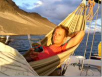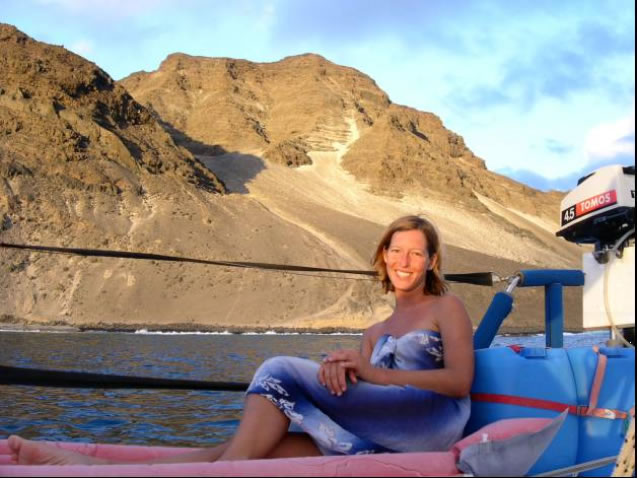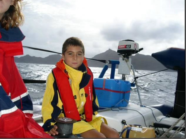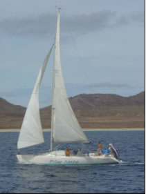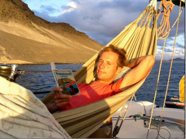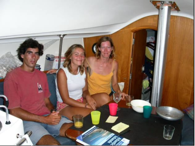 Obwohl wir hier eine Traumbucht mit dem zugehörigen Riesenfischmarkt nur für uns alleine hatten und auch die der Bucht vorgelagerten Steilwände abwechslungsreiche Tauchplätze boten, zog es uns trotzdem wieder weiter zum Hauptort der Insel, Tarafal. Auf der Fahrt hing ein 1 Meter langer Thunfisch an unserer Schleppangel und ging aber leider kurz vor dem Heck vom Haken, da wir zu langsam waren und der Fisch sich durch den nachlassenden Druck losreißen konnte. In Tarafal angekommen stach uns ein 7 Meter langes Aluminiumboot Namens Peloc`h ins Auge. Es waren tatsächlich unsere französischen Freunde Sara und Juan, mit denen wir in Teneriffa ein Treffen auf den Kapverden ausgemacht hatten. Die Beiden sind sogar noch jünger als wir und bei einem Wodka Orange mit Popcorn erzählen sie uns ihre Geschichte.