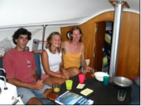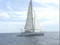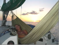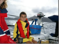 Auch die Mambo hing in Sal vor Anker und litt an einem ähnlichem Schicksal wie wir - die längst überfälligen Schulunterlagen für den Fernkurs des neunjährigen Nils waren immer noch nicht eingetroffen. Da wir ein kleines Rennen mit der 47 Fuß langen Mambo zur 90 Seemeilen entfernten Nachbarinsel Sao Nicolau machen wollten, verbrachten wir noch ein paar geruhsame Tage in Sal und unternahmen ein paar nette Tauchgänge zusammen mit Johan. So manch Zackenbarsch landete in unserer Pfanne und bescherte uns die notwendigen Vitamine. Abends trafen wir uns meist auf ein paar gute Schlücke auf der Mambo, wo wir Gelegenheit hatten unser Französisch gewaltig zu verbessern. Johan ist ein total hilfsbereiter Kerl und verhalf der Blue Note zu einer absoluten High Tech Navigationssoftware mit auf Pilotcharts basierendem Routenplaner und zwei eindrucksvollen Navigationsprogrammen, die mit dem GPS der Blue Note gekoppelt werden konnten. An einem dieser Abende gebaren wir die Idee zusammen mit der Mambo über den "Teich zu schippern", da diese ohnehin die selben Abreisepläne wie wir hat und obendrein noch über ein satellitengestütztes Wetterfax verfügt. Wie leider zu erwarten war kam der Fernkurs von Nils nicht an und so verschoben auch wir die langersehnte Abreise immer wieder auf den nächsten Tag. Natürlich war uns nicht langweilig - die Tage verflogen mit Arbeiten wie Dichtungswechsel am Klo und am Wasserhahn, Zusammenräumen unseres Kellers, erste Hilfe für die in der Bilge stark verrosteten und teilweise schon ausgeronnenen Dosen und Inventarisierung unserer gesamten Vorräte und auch das Werkzeug musste mal wieder entrostet und eingefettet werden. Während unserer Tauchgänge mit Johan jagten wir nach Fischen vor der Steilküste Palmeiras. Jo - Jo Tauchgänge waren unvermeidlich, da bei einem Sicherheitsstop vom Fischblut unweigerlich Haie angelockt werden würden. Nachdem wir einmal zu tief ankerten, den Anker versetzen mussten und anschließend gleich wieder tauchten bekam ich tags darauf merkwürdige Schmerzen: Ich konnte nicht sagen ob es nun Ohren- oder Halsweh war und hatte zusätzlich auf der rechten Seite starke Kopfschmerzen wie nach einem blauen Fleck, die aber doch von innen zu kommen schienen. Nach etlichen Aspros und einem Versuch der kalten Rekompression war aber alles wieder in bester Ordnung.
