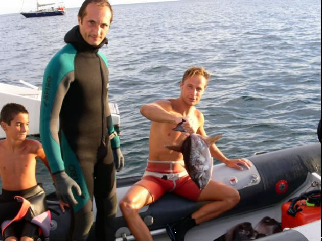Bei einem abschließenden Tauchgang war starke Strömung. Instinktiv hielt ich mich, nachdem wir ins Wasser gesprungen waren, am Boot fest und konnte gerade noch Johan am Ende seiner Harpune zum Boot ziehen.