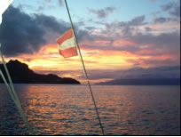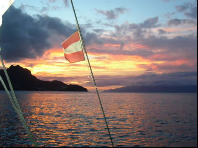 Während eines farbenprächtigen Sonnenuntergangs liefen wir in den von steilen Felswänden umrahmten Naturhafen Porto Grande ein.