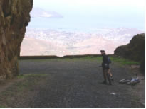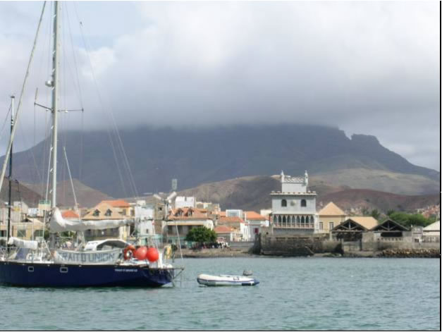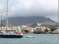Lästig fielen uns die Boat Boys, die sich ihr Geld mit dem Hüten der Dingis verdienten. Beansprucht man ihre Dienste nicht, kann man damit rechnen, dass vermutlich genau von jenem Boat Boy das Dingi aufgeschlitzt wird. Mit Mambo zusammen bildeten wir eine Fahrgemeinschaft und während eine Crew auf Landgang war blieb immer jemand von uns bei den Booten und spielte Taxi. Bei soviel Raffinesse waren selbst die Boat Boys paff und ließen uns in Frieden. In Mindelo legte sich Conny einen Riesenvorrat von Süßigkeiten für die Atllantiküberquerung an, der allerdings schon nach wenigen Tagen beträchtlich geschrumpft war. Die relativ günstigen Bananen, die vom benachbarten, fruchtbaren Santo Antao eingeschifft wurden, bereicherten unseren Speiseplan ungemein. Das restliche Gemüse blieb wie überall sonst auf den Kapverden unerschwinglich. Lediglich mit dem Brot aus Sao Vicente, das schon nach wenigen Tagen zu Schimmeln begann hatten wir schlechte Erfahrung gemacht. Am nächsten Tag ging es mit dem Rad zusammen mit Conny entlang der für die Kapverden typische holprigen Kopsteinpflasterstraße auf den höchsten Gipfel der Insel, dem Monte Verde. Die in den Fels geschlagene Strasse führte entlang einer mehreren hundert Meter hohen Steilwand und gab tolle Ausblicke auf den Hafen, dem Hauptort Mindelo und den angrenzenden Küstenstreifen frei. Schließlich verschwand sie in den Passatwolken und wir konnten die immer grüner werdende Berglandschaft mit ihren Maisfeldern nur erahnen. Ungleich den meisten Fahrtenseglern, wie zum Beispiel das deutsches Ehepaar, das schon seit einem Jahr mit ihrem Waran Kat hier in Mindelo auf den richtigen Wind wartete, zog es uns, wie auch die Mambo schon bald weiter zum nächsten Abenteuer.