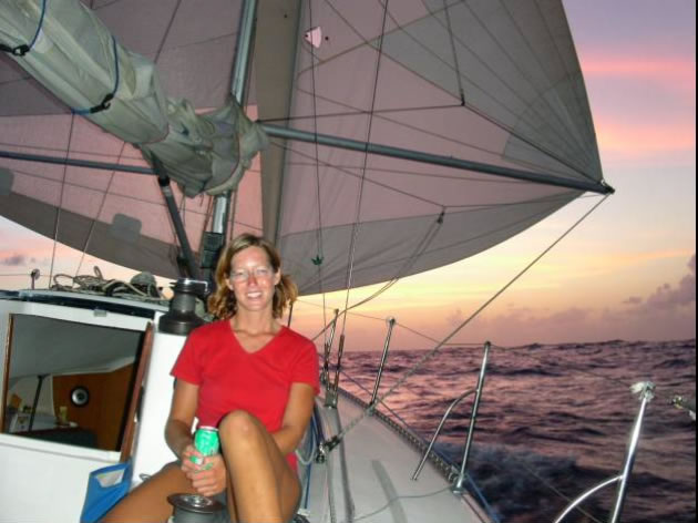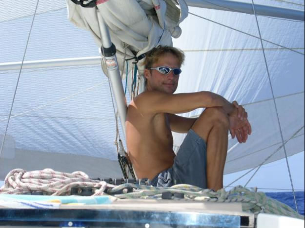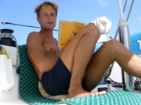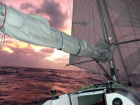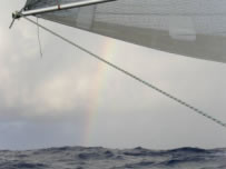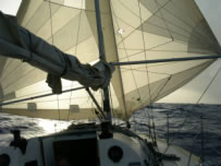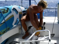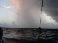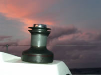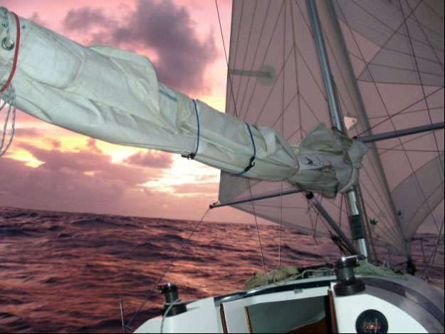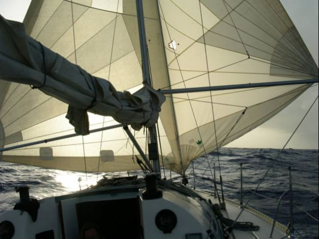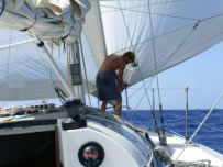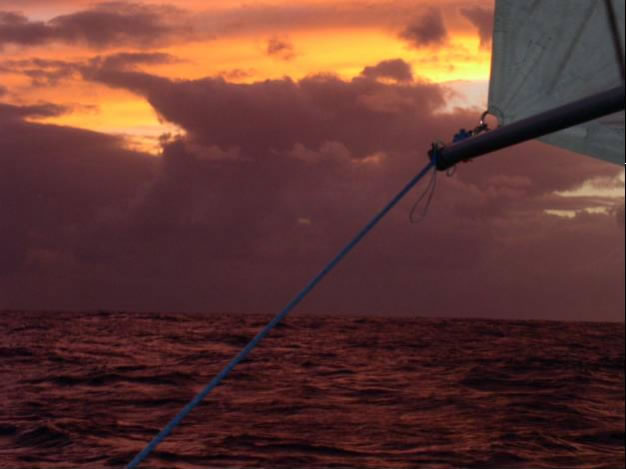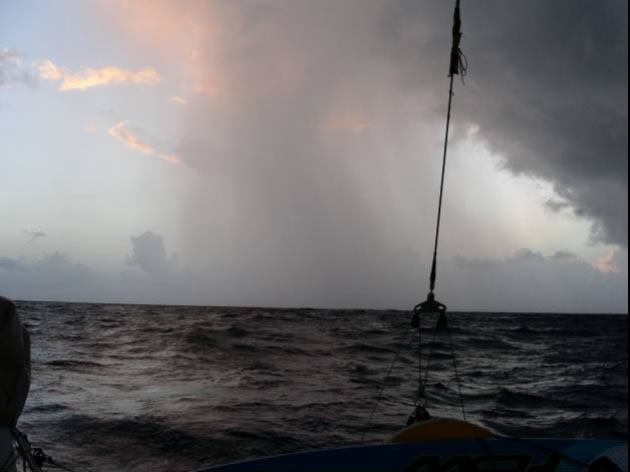 Tag4: (147sm, Wind ONO, 4Bft) Erneut versuchen wir den inzwischen reparierten Spi zu setzen, aber die noch immer starken Wellen aus Nord und der durch laufend über uns ziehende schwarze Wolken verursachte böige Wind machten gemütliches Fahren mit Autopilot unmöglich. Abends hatten wir, wie an den Wellen zu erkennen war, plötzlich Gegenströmung. An einer Stelle mit 5000 Meter Wassertiefe mitten im nach Westen setzenden Nordäquatorialstrom eigentlich undenkbar - ob sie durch Unterwasservulkanität verursacht wurde? Bei Sonnenuntergang flaute der Wind schließlich auf 3 Bft ab und wir ersetzten die Genua 3 durch die Genua 1. Von nun an ging es die nächsten 5 Tage wieder mit Etmalen von 150 bis 180 Meilen ordentlich vorwärts und an unserer Besegelung änderten wir daher 5 Tage nichts. Meine innere Ruhe, die ich inzwischen wieder gefunden hatte, wurde lediglich durch die tieffliegenden, schwarzen Regenwolken, die meist morgens und abends über uns zogen, gestört, da sie auch böigen Wind mit sich brachten.
