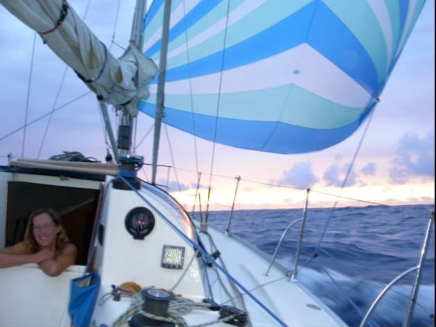 Tag11: (147sm, Wind O, 4Bft) Ein Barrakuda beißt auf unserer 70 kg Leine und wird beim Einholen allerdings von einem Hai angeknabbert. Schmeckt uns trotzdem ausgezeichnet, obwohl wir ihn mit dem Hai teilen mussten. Das Barometer ist jetzt schon von 1010 auf 1005 mbar gesunken und der Wind flaut immer mehr ab, so dass wir unseren Leichtwindspi setzen. Wetterleuchten und stark drehender Wind zwingt uns aber nachts den Spi zu bergen.
