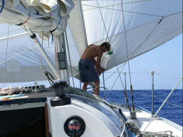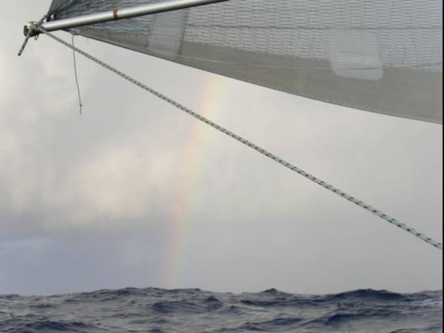 Tag12: (119sm, Flaute) Den inzwischen starken Regen empfinden wir als Segen, solange wir es im gemütlichen Schiffsinneren draußen plätschern hören. Morgens versuchen wir wieder unser Glück mit dem Spi, der allerdings wieder mal an der gewohnten Stelle reißt. Nach der Reparatur versuche ich mit Klopapier den restlichen Kleber der alten Segelnummern zu entfernen, was vorerst gelingt. Bis 22 Uhr wechseln wir bei starkem Regen und Weltuntergangswetter je nach Wind die Besegelung zwischen Spi, Genua und Motor. Sogar das Großsegel haben wir einmal raufgezogen, allerdings eher zum Waschen mit Süßwasser. Ab dann allerdings schläft der Wind völlig ein und wir motoren. Ob wir genug Diesel für die letzten 280 Meilen haben?