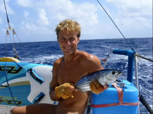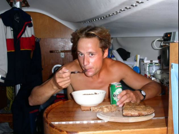 Tag7: (170sm, Wind ONO, 4Bft) Schon wieder ein Seevogel in der Fischerleine! Nachts sehen wir den ersten Frachter seit Tagen, der aber per Funk nicht antwortet. Sonst vergehen die Tage alle hurtig mit schlafen, essen und lesen. Ich bin überrascht wie groß mein Appetit ist, obwohl ich kaum Bewegung mache.