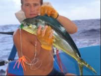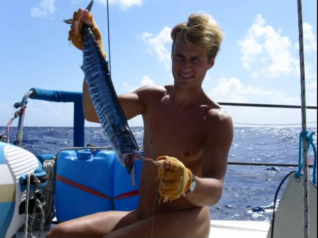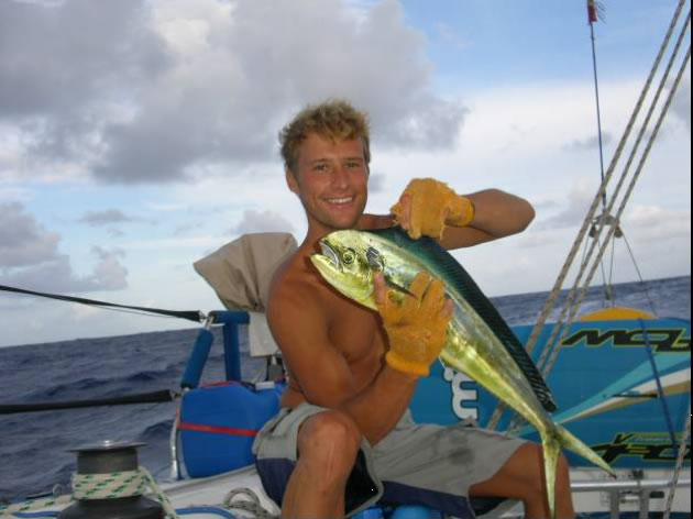 Tag3: (157sm, Wind ONO, 5Bft) Der Wind wurde immer weniger und stabilisierte sich mit 5Bft aus ONO. In der Nacht biss ein Riesenfisch das Drahtvorfach unseres Lieblingsköders ab. Schließlich hatten wir aber noch einen zweiten Köder dieser Art und vormittags lag schon wieder eine Goldmakrele in der Pfanne. Als wir nachmittags dann eine 70 Zentimeter lange Goldmakrele fingen, den größte Fisch, den ich je gefangen habe, konnten wir es uns leisten mit dem Fleisch ein wenig zu experimentieren. Einen Teil legten wir roh in Zitrone ein, den anderen in Balsamicoessig. Resultat war ein mit Mais und Zwiebel gemischter unglaublich schmackhafter Fischsalat, der sogar Conny begeisterte. Abends sahen wir in einiger Entfernung ein Toplicht mit fast doppelter Geschwindigkeit vorbeiziehen. Ob das Mambo war? - wenn ja hätte sie Etmale von 240 Meilen und einen Schnitt von 11 Knoten segeln müssen um den einen Tag aufzuholen.