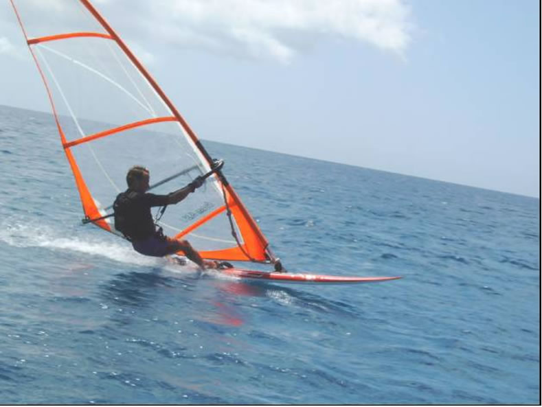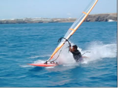 Surfen war ganz nett aber nicht allzu sensationell, also zog es uns weiter in den Süden. Während eines kurzen Zwischenstopps in Puerto del Rosario taten wir der Bürokratie unsere Schuldigkeit und klarierten endlich offiziell ein. Außerdem hatten wir Gelegenheit unseren Proviant etwas mit Frischkost aufzufrischen. Übernachtet haben wir in einer Bucht mit einem netten Fischerdorf, vor der wir mit Böen bis zu 35kn empfangen wurden. Am nächsten Tag stand wieder surfen am Programm und zwar auf der für ihren Wind bekannten Halbinsel Jandia, die mit der weltgrößten Surfschule aufwarten kann. Leider war der Wind nicht so ganz wie versprochen und setzte nach einigen böigen Pusteversuchen, die mich auch auf das Wasser trieben plötzlich aus. Zurück zu kommen war bei absoluter Flaute mit meinem Semisinker nicht gerade einfach, vor allem da ich schon einige Meilen vom Boot entfernt war. Gott sei Dank entdeckte das auch ein Surflehrer der mich mit dem Motorboot zurück zu der vor Anker schaukelnden Blue Note brachte. Bei einem Bier erklärte der etwa gleichaltrige Münchner, er sei nun schon seit einigen Jahren hier gestrandet, kommt ganz gut mit seinem bescheidenen Gehalt zurecht und vermisst seine Heimat überhaupt nicht - warum auch nicht!