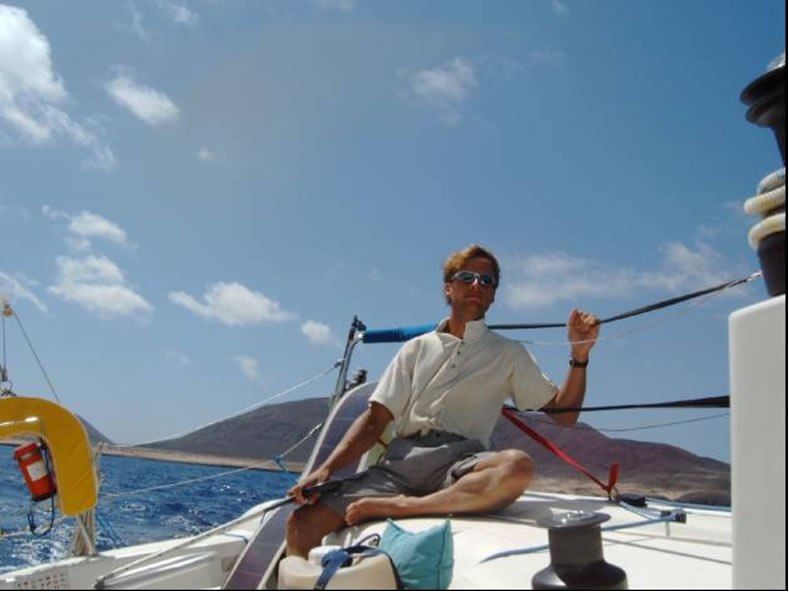Die 270 Seemeilen lange Überfahrt von Madeira nach La Grazosa bei Lanzarote war wirklich ein Klacks. Bei halben Wind mit etwa 4 bft zischten wir mit bis zu 12 Knoten Speed unserem Ziel entgegen und benötigten deshalb nur anderthalb Tage. Sehr zum Leidwesen des Fischers in mir - denn bei dem Speed scheint den Fischen der Appetit auf Gummioktopus zu vergehen. Zuletzt packte uns sogar noch der Ehrgeiz und wir steuerten von Hand, da wir noch vor Sonnenuntergang unseren Ankerplatz Bahia de la Cocina (Strand der Muscheln) an einem erloschenen Vulkankegel erreichen wollten. Leider war die Sonne schneller und die mühsame Annäherung in der mondlosen Finsternis blieb uns nicht erspart.