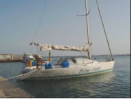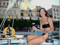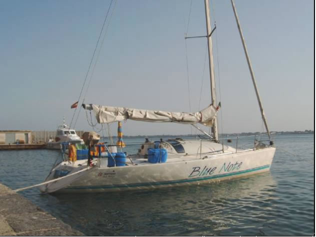 Otranto gefiel uns ganz gut und nach leckerem Eis gingen wir schlafen. Kaum hatte ich die Decke über dem Kopf veränderte sich das Plätschern des Wassers am Boot merklich und ich hatte das Gefühl wir wären unterwegs. Da meinte Conny auch schon erregt: da sieht's aber ordentlich nach Gewitter aus! Neugierig steckte ich den Kopf aus der Luke und der halbe Straßenbelag blies mir ins Gesicht und aufs Boot. Der Wind hatte um 180 Grad gedreht und zerrte mit Sturmstärke an unseren Leinen und dem locker verzurrten Großsegel. Regen, Blitze und ein paar Minuten später war es wieder friedlich. Bis auf - oh Schreck - das SAS Rettungsboot donnerte 10 Meter mit Vollgas an uns vorbei. Die einen Meter hohe Heckwelle knallte die Blue Note und die anderen Boote an die Mole, dass die 30cm Fender auf 5cm zusammengepresst wurden. Kurz dachte ich unsere Reise wäre hier schon zu Ende! Gott sei Dank sind wir mit dem Schrecken davon gekommen.