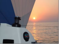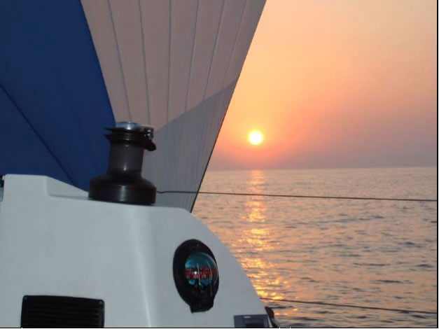Tag 8: Bei Sonnenaufgang vor der Strasse von Messina 6bft gegenan, oh Wunder - zusehends drehend auf achterlichen Wind aus O. Es wird doch noch ein schöner Abschluss dieser Odyssee nach Syrakus. Wir zischen mit 8kn unserem Ziel entgegen.