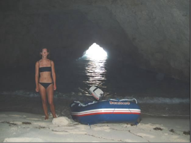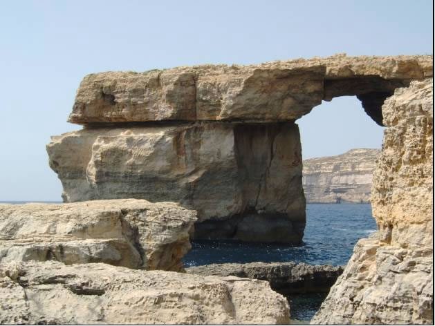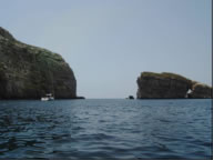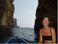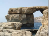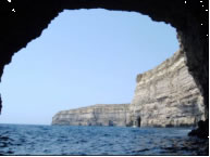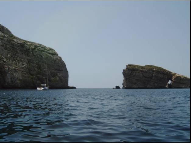 Von der Crystal Lagune aus betauchten wir am nächsten Tag eine nahegelegene Grotte und eine eindrucksvolle Höhle an der Südostspitze Cominos. So eindrucksvoll die Unterwasserlandschaft aber auch war, vom Fischreichtum auf Comino waren wir bisher ein bisschen enttäuscht. Am nächsten morgen fanden wir einen weiteren unglaublich eindrucksvollen Ankerplatz auf Gozo in der Dwejra Bay. Diese kreisrunde Bucht ist umschlossen von 50m hohen Felsen und einem vorgelagerten Felsklotz, dem Fungusrock und bietet damit auch vor Westwinden Schutz. Zufällig liegen mit Blue Hole, Inland Sea, Crocodile Rock und Azur Window die besten Tauchplätze Gozos in Schlauchbootreichweite. Mit Riesenfischen und landschaftlich unbeschreiblichen Tauchplätzen wurden wir diemal verwöhnt. So sahen wir am Crocodile Rock 4 Zackenbarsche, wovon einer mehr als einen Meter lang war. Riesengroße Goldstriemen und Zahnbrassen begleiteten uns auch ab und zu während wir die Steilwand erkundeten. Bei Fungus Rock trafen wir einen Schwarm junger Barrakudas. Der letzte Tauchgang dieses Tages war allerdings unübertrefflich und mit tropischen Tauchgebieten vergleichbar. Mit dem Schlaucherl ankerten wir trotz schäumender Brandung innerhalb eines Felsenriffs, stiegen dort mit der Tauchausrüstung an Land zum Blue Hole, einem kleinen See der über eine eindrucksvolle Unterwasserhöhle mit dem Meer verbunden ist und tauchten durch das Blue Hole zum Azur Window, einem Riesen Felsbogen der mit 30m Spannweite auch von Land beeindruckend ist. Vor der Steilwand bei Azur Window wurde das Wasser beinahe schwarz vor Fischen und Mitten in den Schwärmen tummelten sich wieder Zackenbarsche, Goldstriemen und Zahnbrassen.