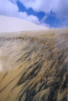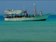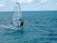 Wir hätten keine 10 Minuten später einlaufen dürfen - bei Nacht wären wir von den sich mit ohrenbetäubendem Getöse an der Sandbank brechenden Wellen an den Strand geworfen worden. So fanden wir aber doch den Eingang zum Ankerplatz und fielen tot ins Bett. Selbst das heftige Geschaukel störte uns erst am nächsten Morgen und so zogen wir zum nächsten Ankerplatz Cayo Herradura, einer nur mit Fischerhütten besiedelten, Tortuga vorgelagerten Insel. Zwar war der Ankerplatz ruhig aber das Wasser völlig trüb durch den vom Schwell aufgewirbelten Sand. Windsurfen war aber perfekt, da die konstanten 25 Knoten Wind durch keinerlei Hindernisse gebremst wurden - die Insel besteht lediglich aus einem Sandfleck mit einigen Fischerhütten und einem rot weiß rot gestreiften Leuchtturm. So wurden wir hier Attraktion Nummer 1 für die vor Anker liegenden Fischer und noch hunderte Meilen entfernt auf den Islas Aves erkannten uns die Fischerboote wieder als die "un poco loco" Österreicher mit dem blauen Surfbord.