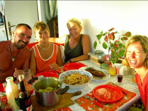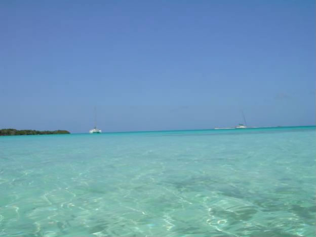 Auf Cayo Herradura freundeten wir uns mit der französischen Bavaria 37 Bibounde mit George, Nathalie und ihrem Sohn an, die schon seit 5 Jahren unterwegs waren. Gegenseitig luden wir uns auf Köstlichkeiten wie Würstel mit Fleischfüllung und Kartoffel dazu kaltes Polarbier sowie unsererseits die berühmten Bluenote Spagetti und Lobstersalat ein und plauderten wie üblich bei solchen Gelegenheiten über Abenteuer und Erfahrungen der Reise. George, der wie alle Franzosen gut mit der Harpune umgehen konnte, brachte uns zweimal Fisch und so war unser Abendessen immer ein Erlebnis. Eines Abends lichteten wir unseren Anker und segelten nur mit Genua 2 zu den 140 Meilen entfernten Islas Aves, die neben glasklaren Wasser einem ruhigen, da durch ein großes Barriereriff geschützten Ankerplatz bieten können. In diese meilenweiten Ankergründe am Arsch von Venezuela verirren sich wenige Segler und wir legten uns neben das einzige Boot, das zufällig genau in unserer Bucht vor Anker lag. Wir trauten unseren Augen nicht als sich herausstellte, dass der große Katamaran Heldenberg der Wiener Familie Mark und Tina mit dem zwölfjährigen Nick gehörte, die schon seit 8 Jahren mit dem Eigenbau aus Litauen unterwegs sind.