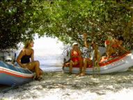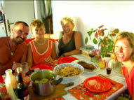 Dafür lernte ich von Nirgo wie man die Langusten mit dem Lasso fängt und konnte bald unseren Speiseplan stark bereichern. Fast zweimal täglich gab es Lobster in allen Variationen von Salat über Lobsteromelette bis hin zu Lobsterspagetthi. Beim Tauchen begleiteten uns riesige Rochen und Tarpons. Die Fische waren so zutraulich, dass es schon beinahe unheimlich war. Abends brachten alle Segler leckere Sachen mit zu Jun Jun und dann wurde geschmaust und geplaudert. Normalerweise darf man nur 3 Tage auf den Testigos bleiben, aber da wir praktisch zur Familie gehörten durften wir so lange bleiben wie wir wollten. Eine Woche verging wie im Flug mit Tauchen, Faulenzen und Langustenkochen und schließlich kam der Tag an dem wir zusammen mit Pierre Richtung Isla Margarita segelten. Für uns war die Zeit auf den Testigos die schönste auf unserer bisherigen Reise und wir wären gerne länger geblieben.....